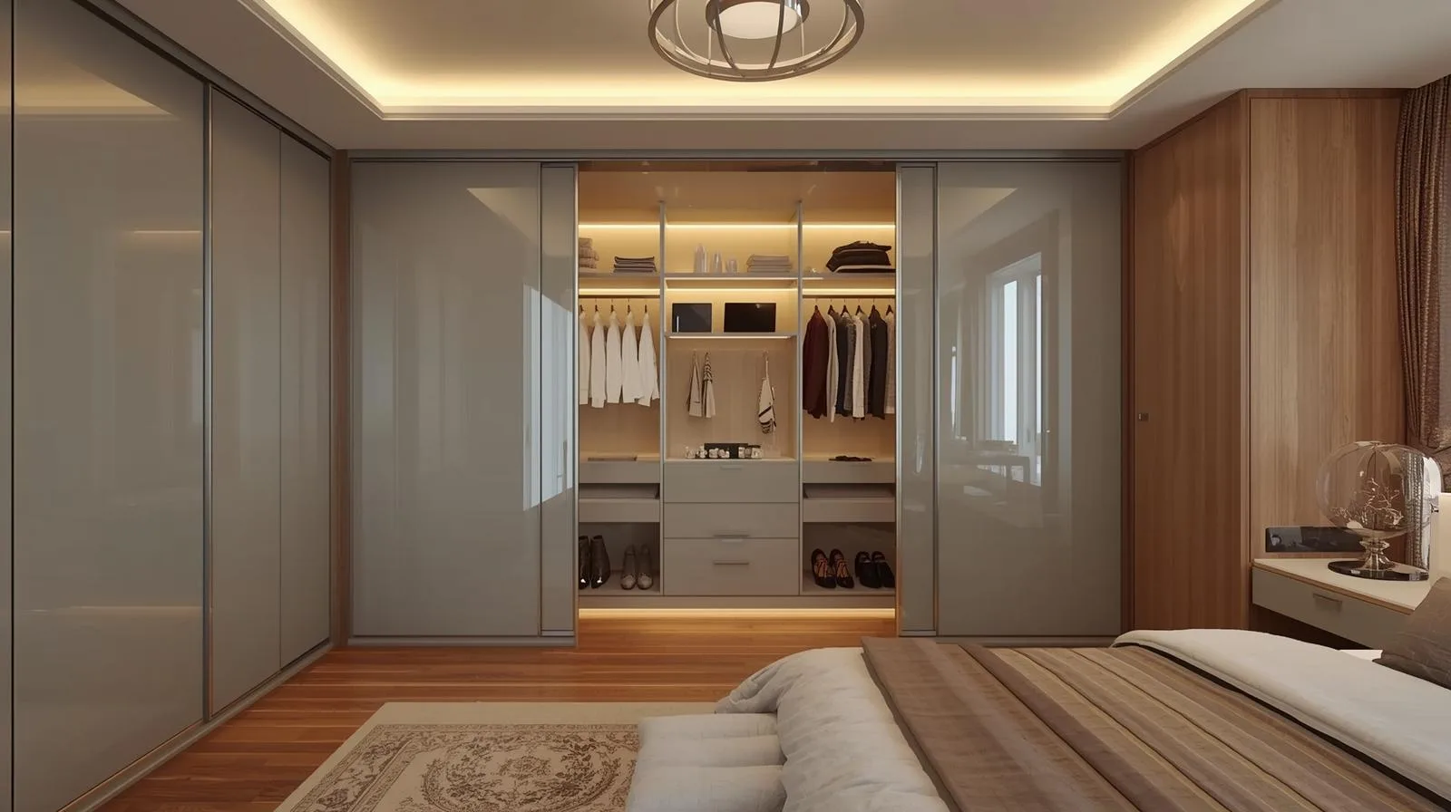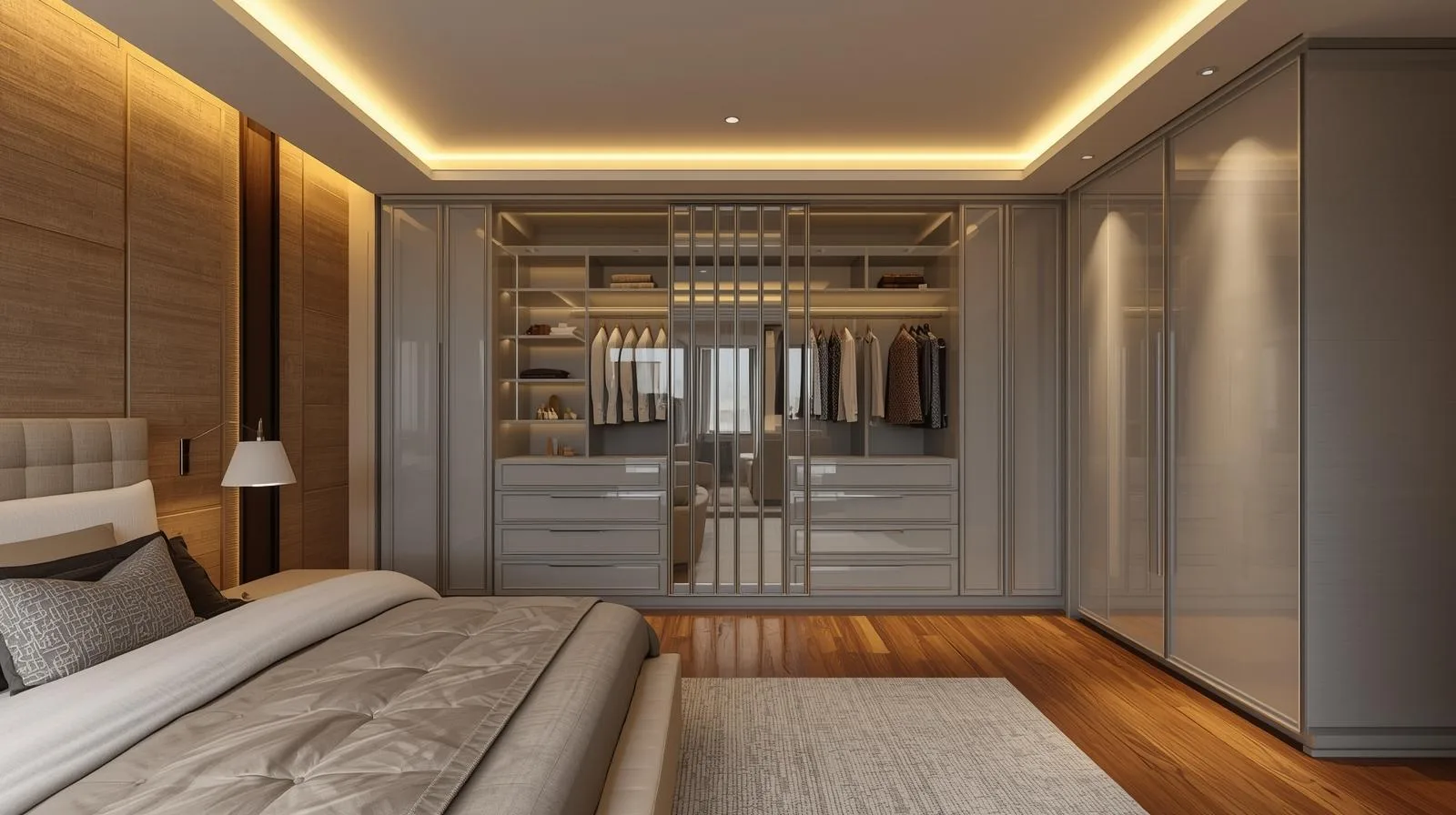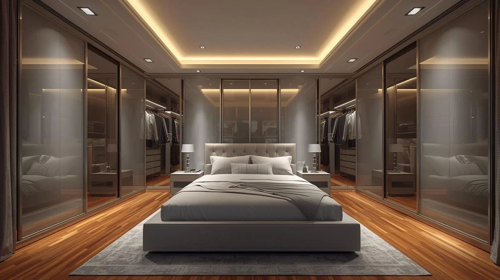 Cao cấp: tủ áo kính kết hợp kim loại, đèn LED viền, cửa trượt tự động.