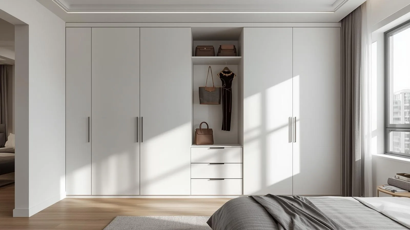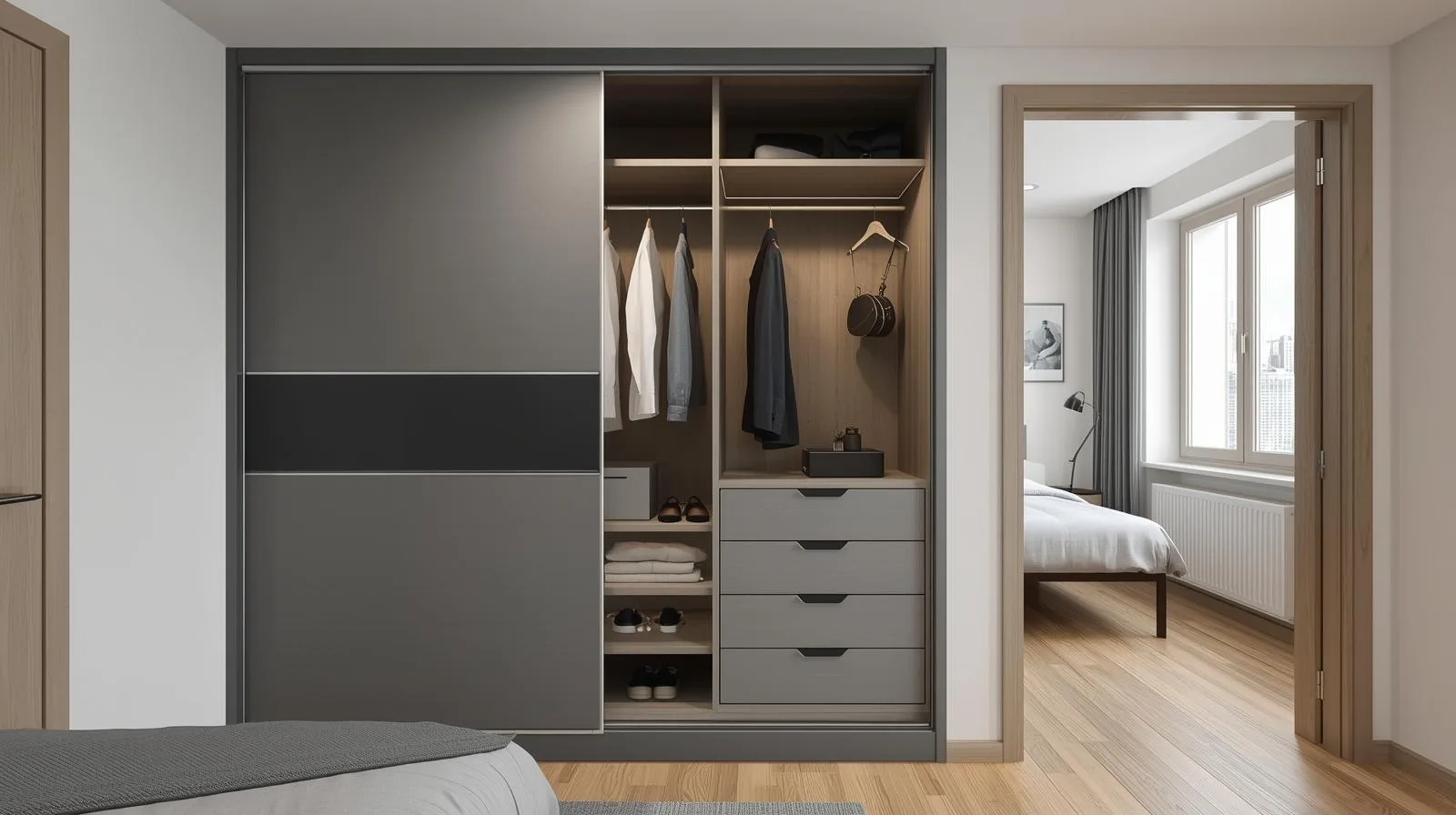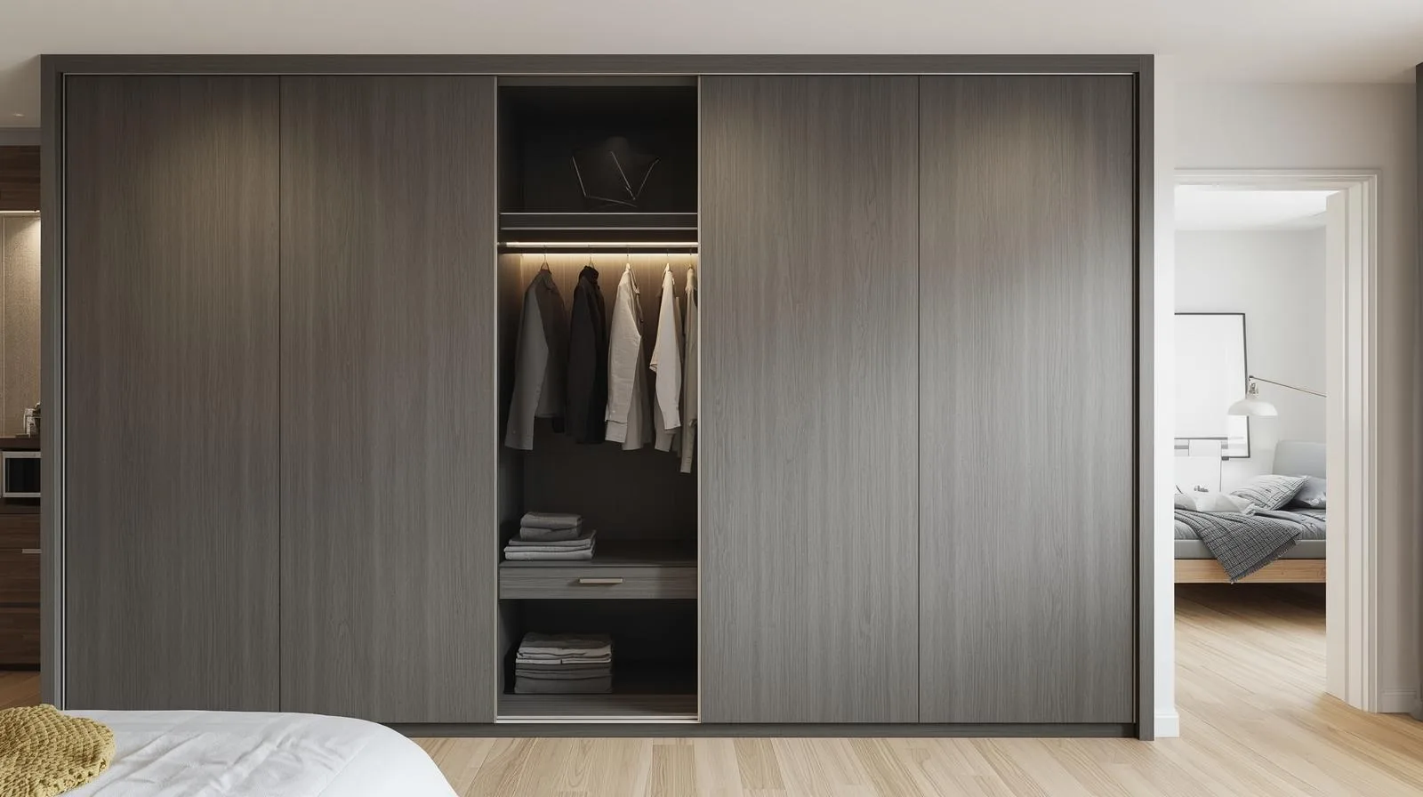 Chung cư – căn hộ nhỏ: Tủ áo Laminate cánh trượt, âm tường giúp tiết kiệm không gian.
