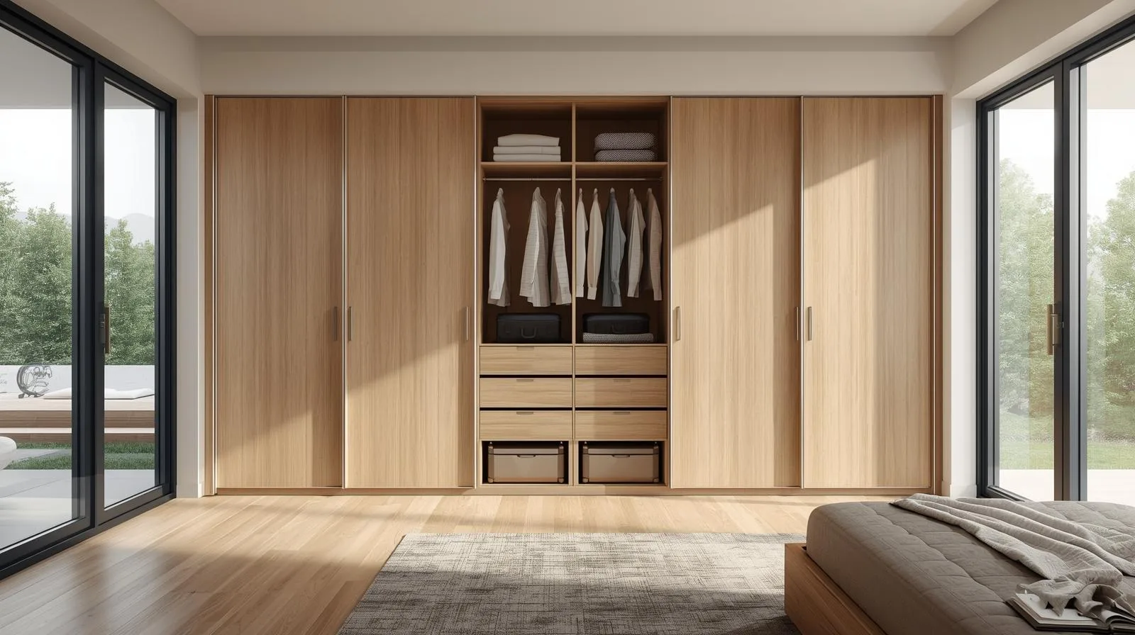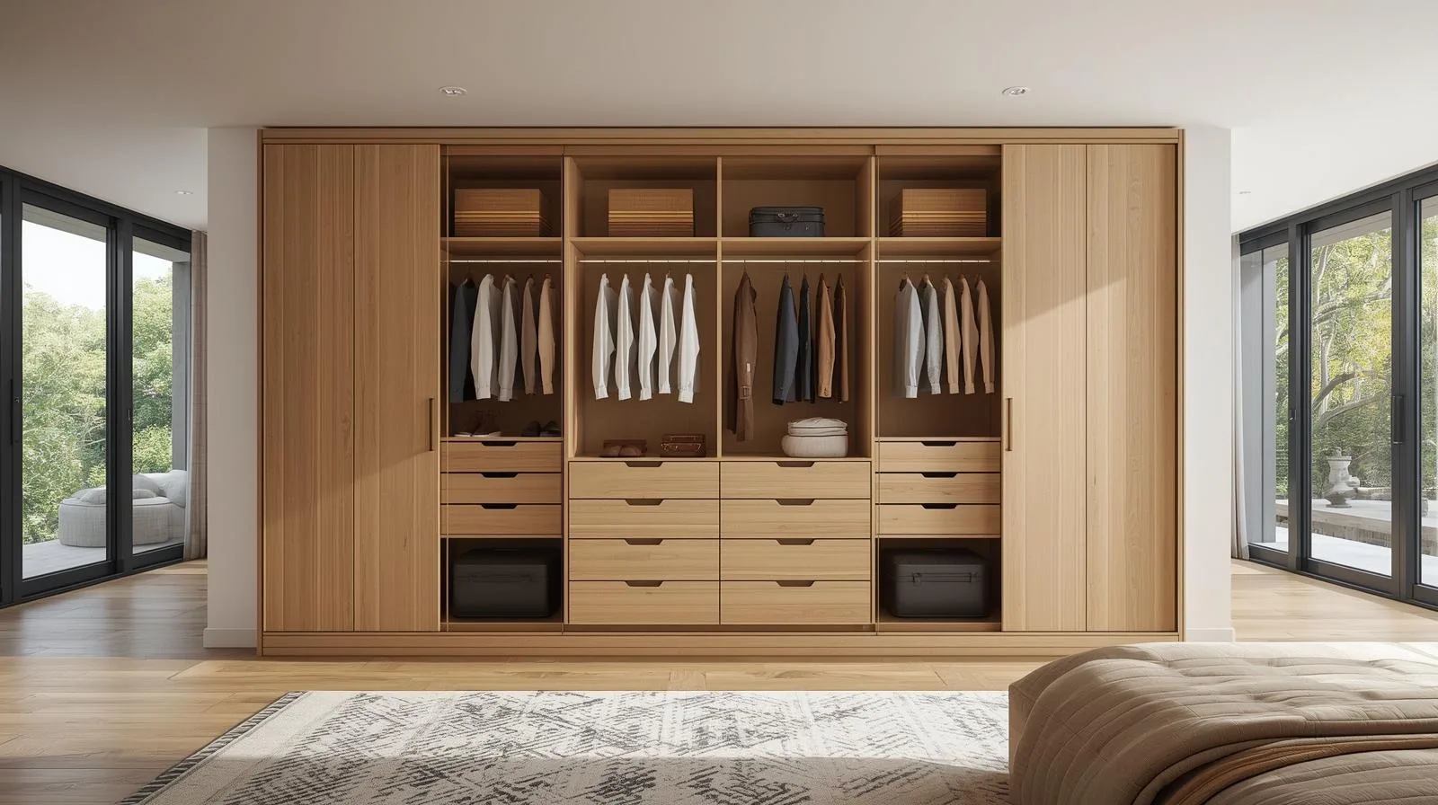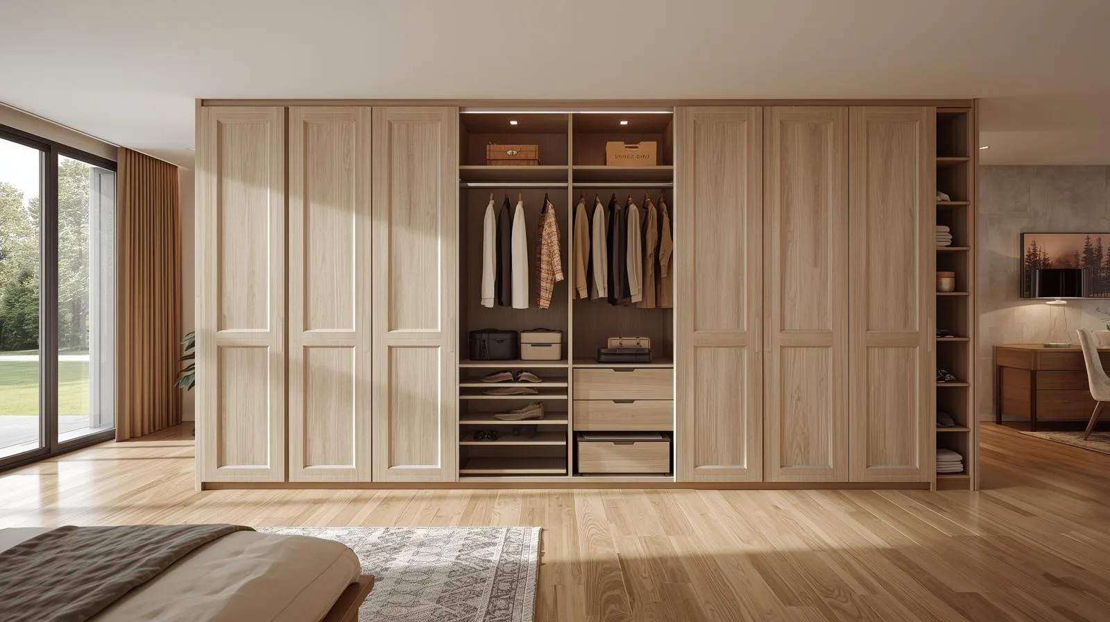 Phòng lớn >25m²: phù hợp tủ áo 2m4 nhiều cánh mở, gỗ tự nhiên.