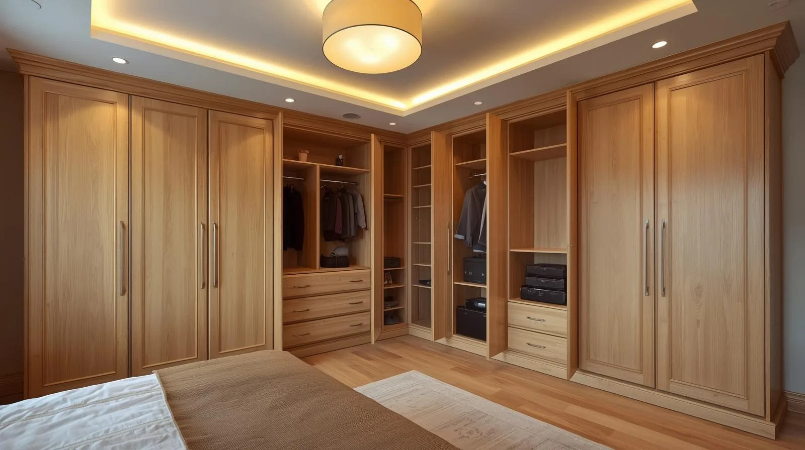 Phòng master: tủ chữ L 5–6 cánh, gỗ tự nhiên, sang trọng.