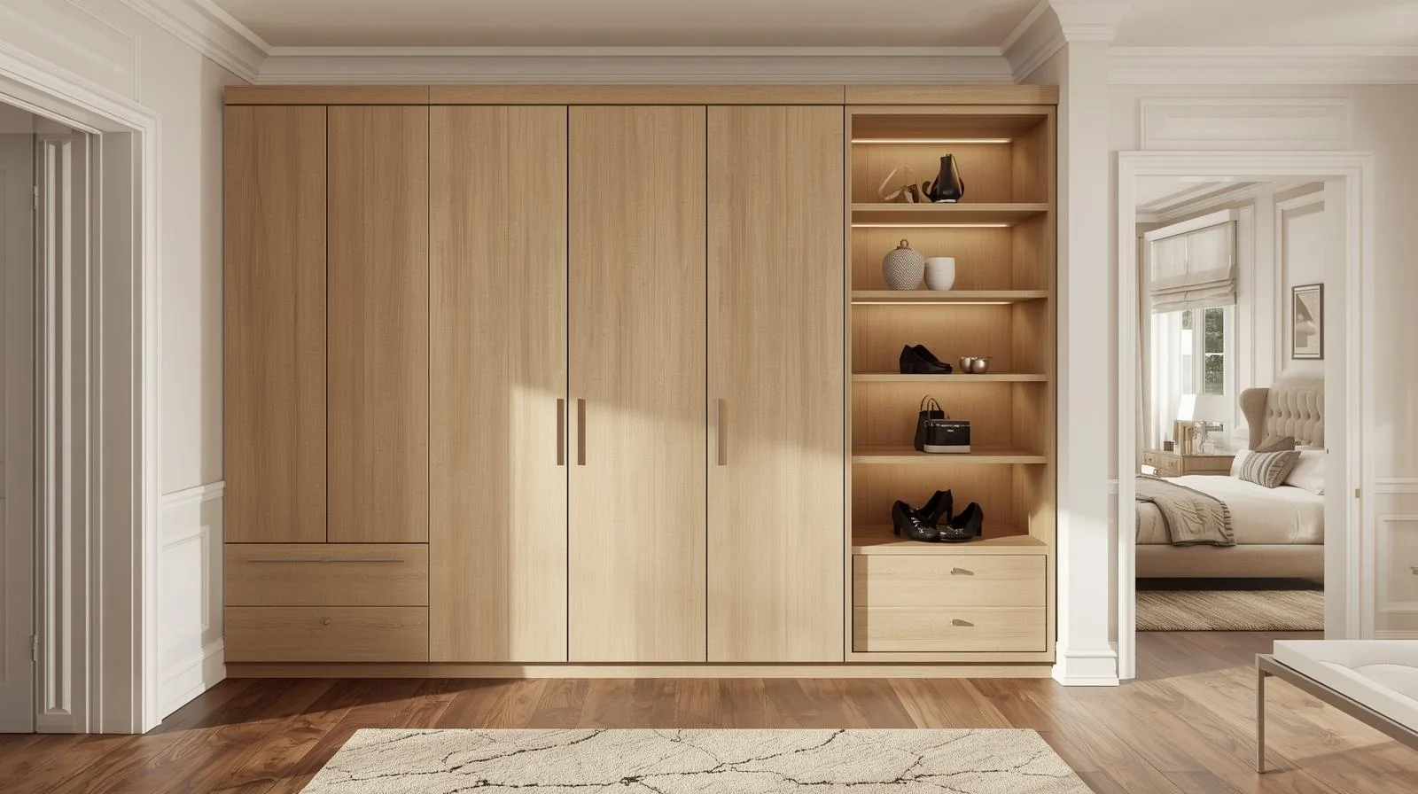 | Tủ áo kết hợp kệ trang trí luxury | 2m6–3m | 6 cánh | Gỗ óc chó, veneer cao cấp | 50 – 90 triệu |