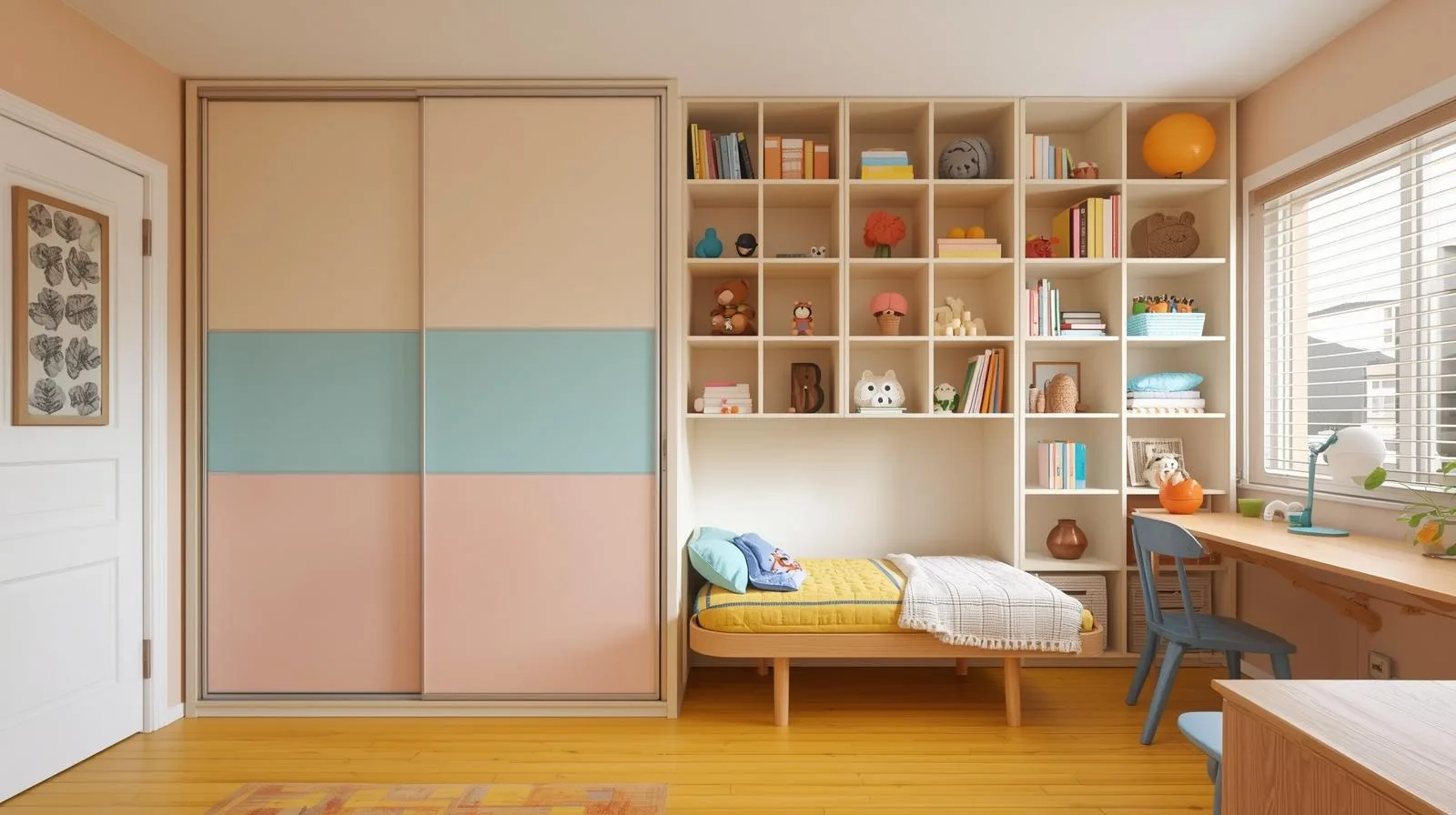 Phòng trẻ em: tủ áo kết hợp kệ để sách, đồ chơi.