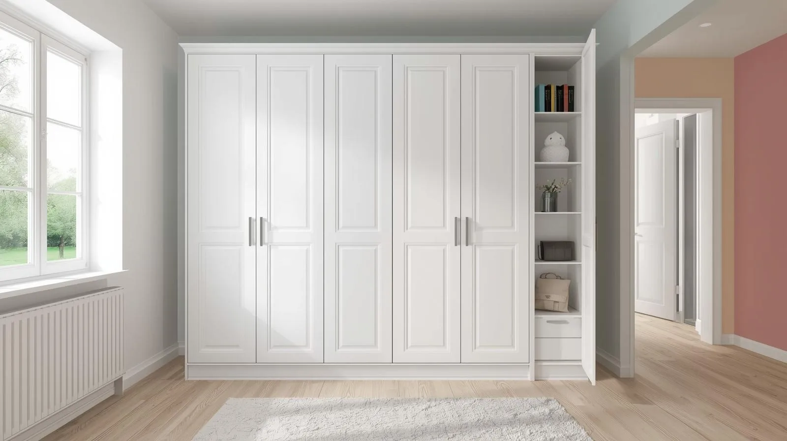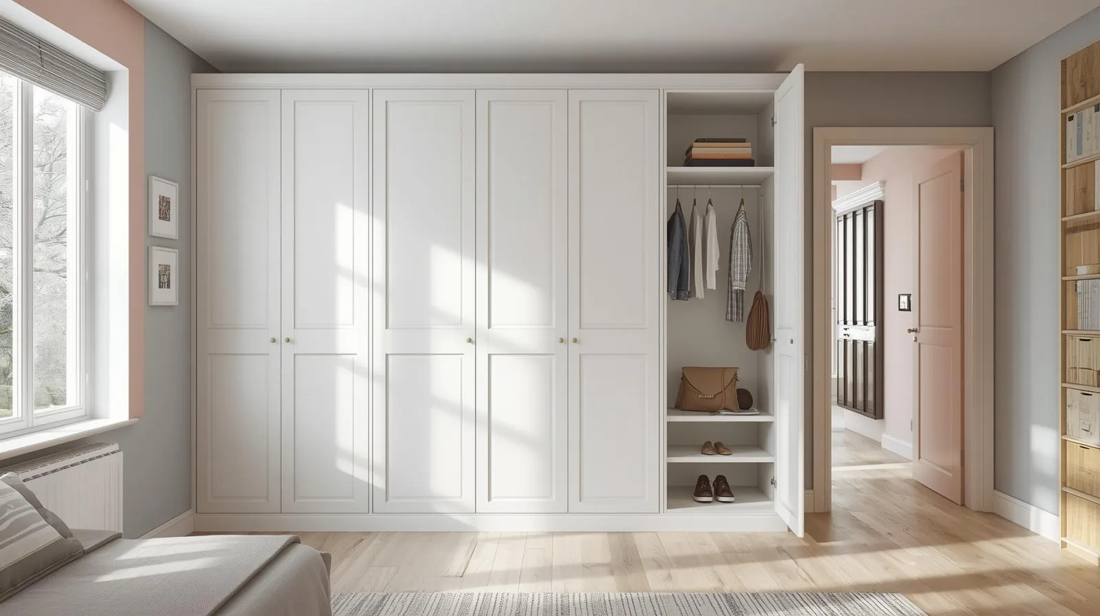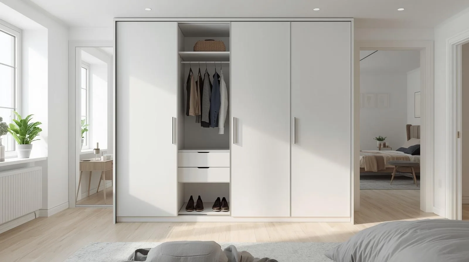 Giải pháp tủ áo: tủ áo âm tường hoặc tủ cánh trượt bằng MDF phủ Melamine/Acrylic.